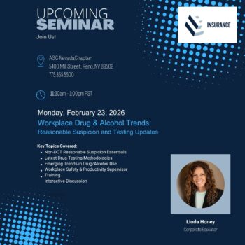 Join us Monday, Feb 23, 2026, 11:30am–1:00pm PST at AGC Nevada (Reno) for Non-DOT reasonable suspicion essentials, the latest drug-testing methodologies, and supervisor training. Reserve your seat.